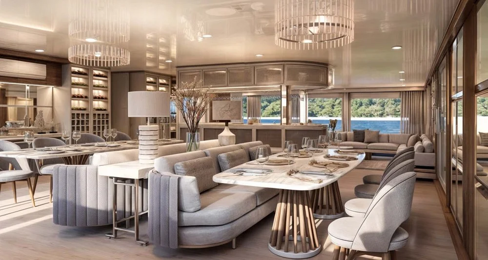 Each of the Monique’s cabins feels like a private retreat. With ensuite bathrooms, convertible beds, and panoramic windows, mornings begin with golden sunrises and seabird silhouettes—without ever leaving your bed. The modern design favors natural tones, giving the spaces a calming, breezy feel.
